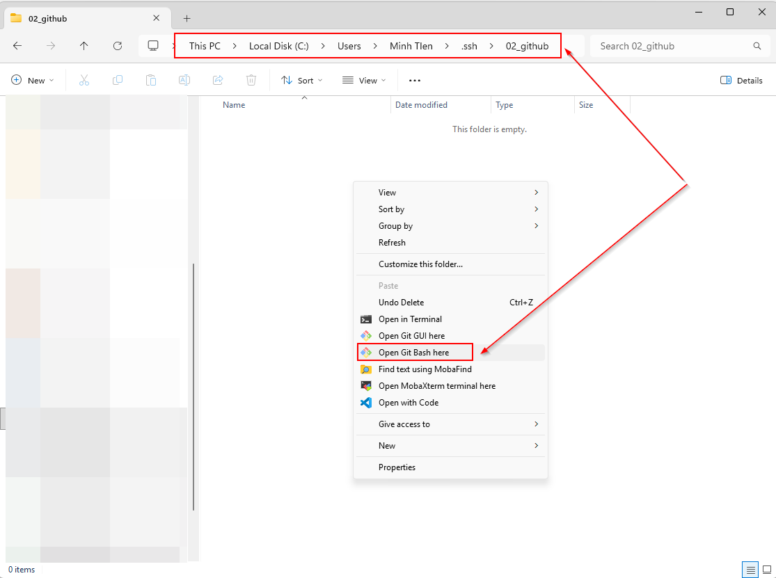 Tips: Để dễ quản lý, mình recommend các bạn hãy tạo folder riêng để chứa nó tại /C/Users/<user_name>/.ssh. Và trong bài viết này, mình đã tạo và mở GitBash tại folder /C/Users/Minh TIen/.ssh/02_github